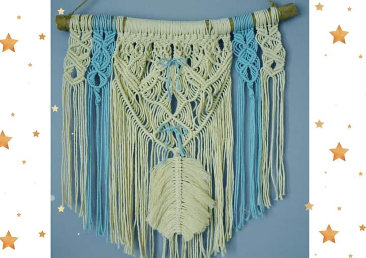 Makrama Boho Biało- Niebieska na drewnianym kijku